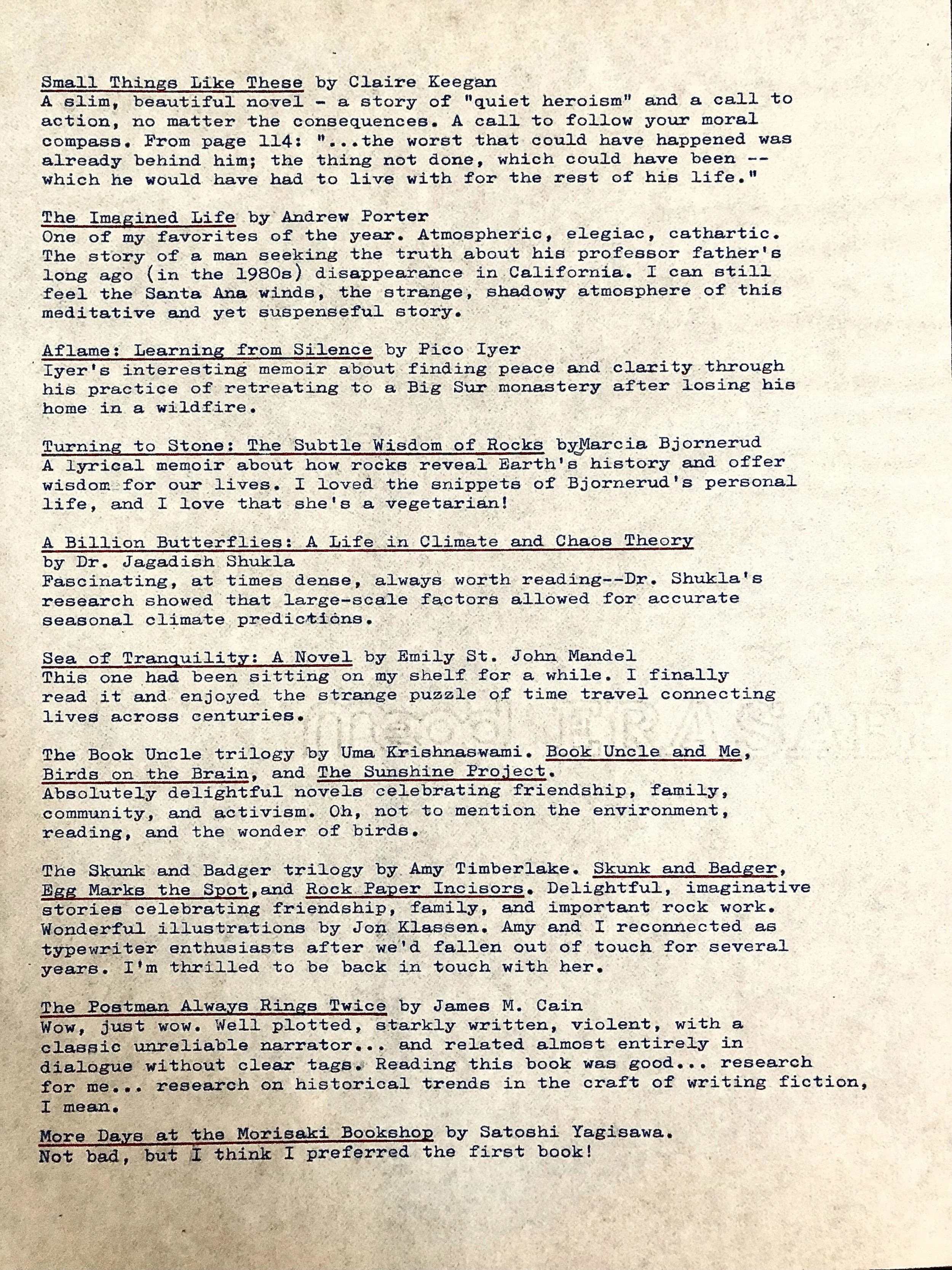 On this last day of December, 2025, I decided to type up a list of books I read this year—at least, the ones I can remember reading! I used my 1966 Hermes 3000 with Petit-Pica typeface, a true joy.